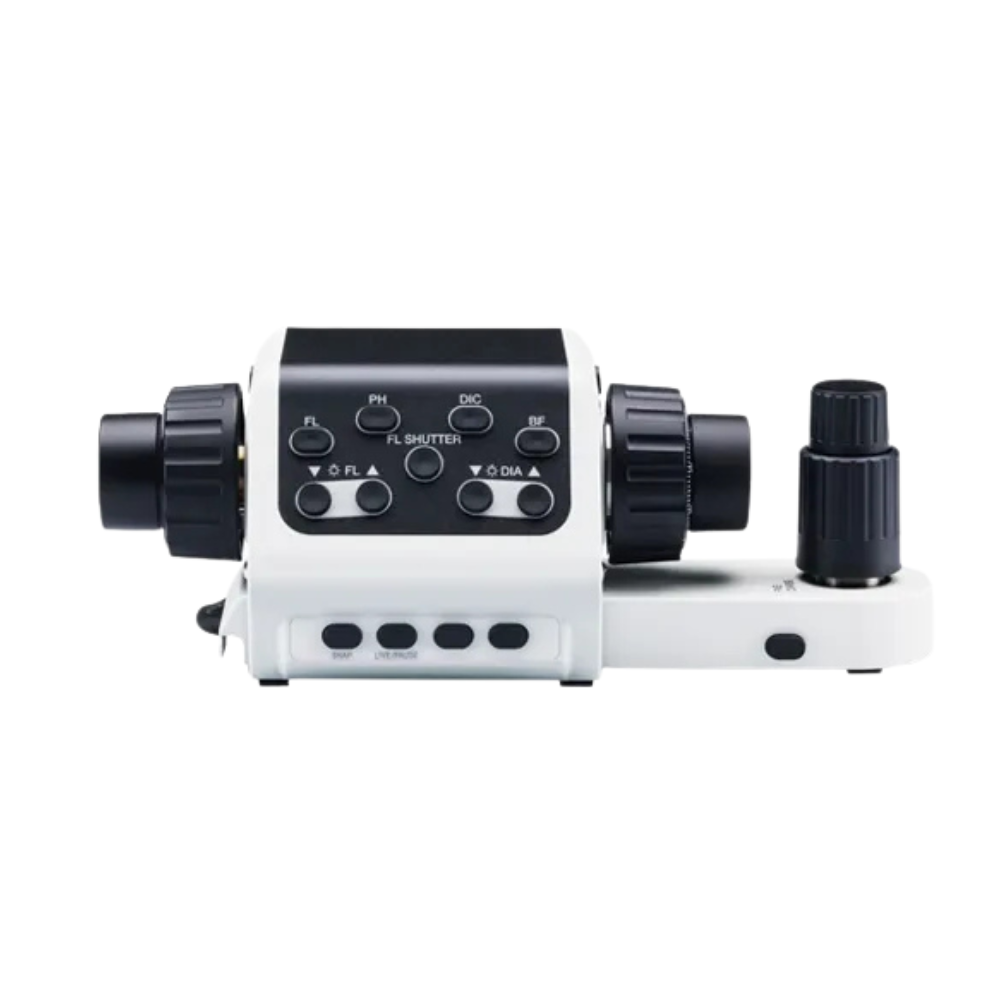 Você pode destacar o controlador da platina da estrutura e colocá-lo onde for mais conveniente. Quando usado com a platina ultrassônica, ele cria um fluxo de trabalho intuitivo com uma operação que imita uma platina de foco manual. Os interruptores no controlador permitem alternar entre diferentes métodos de observação, objetivas e unidades de espelho, enquanto seleciona simultaneamente ajustes de intensidade ou captura de imagem.
